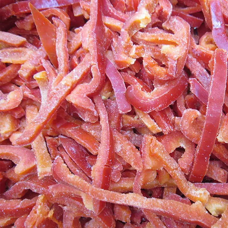 Frozen red pepper strips refer to a deep-processed vegetable product made by quickly freezing fresh red sweet peppers (Capsicum annuum) after shredding through low-temperature quick-freezing technology for long-term preservation. Using “quick-freezing” technology, it maximizes the retention of red peppers’ nutritional value and natural flavor, with each strip maintaining a crisp texture, vibrant red-orange color, and mildly sweet-pungent taste akin to fresh red peppers. This convenient frozen form breaks through seasonal limitations (fresh red peppers are mainly harvested from summer to early autumn), making it a versatile flavor-enhancer for households, catering services, and busy lifestyles. It shares the same high vitamin C (140mg/100g), high carotenoids (e.g., β-carotene), and high-fiber profile as fresh red peppers (~2.1g fiber/100g) and can be quickly cooked, perfectly adapting to modern efficient living needs.